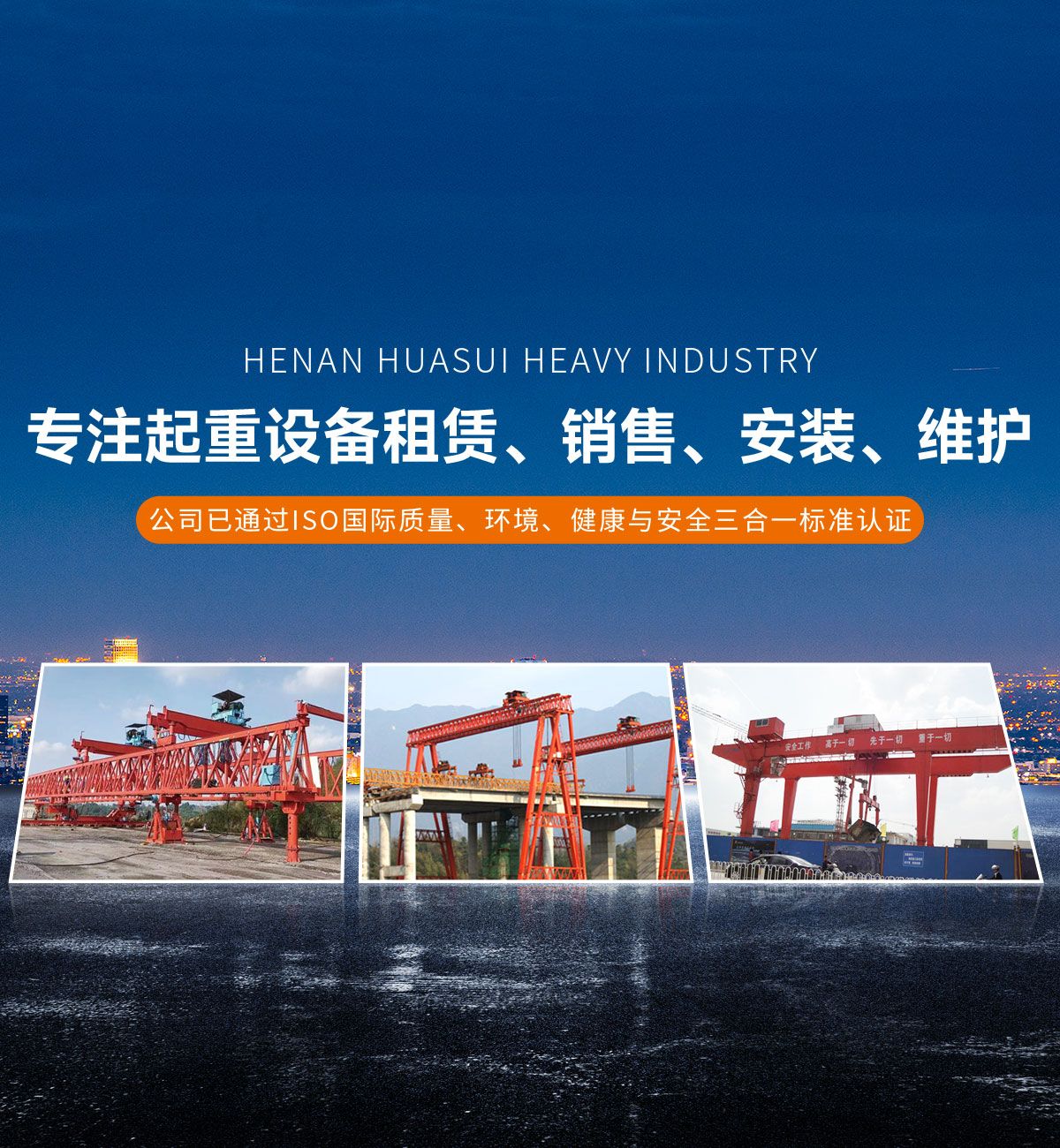河南華隧重工機械裝備有限公司主要從事通用門式起重機、橋式起重機、電動單梁起重機,輪胎式起重機、架橋機、提梁機、遠梁平車、鋼絲繩電動萌蘆、卷揚機、起重配件制造、銷售:起重機械租賃、安裝和維修,起重設備園收,機械設備維修,鋼結構工程承包,橋梁工程及技術咨淘服務,銷售五金制品、機電設備:建設工程監理,建設工程設計,各類工程建設活動,建筑勞務分包,建筑物折除作業,施工作業,工程管理服務,土石方工程施工,裝如發運?! 」疽淹ㄟ^IS0國際質量、環境、健康與安全三合一標準認證,特種設備制造許可證和特種設備安裝改造維修許可證。擁有完熟的質量管理體系。嚴格的管理制度,強大的生產能力和先進的檢測手段,在保證產品質量的同時,也具備了極強的市場競爭力?! 」緢猿挚萍紕撔聻槔砟睿a品質量為核心,注重信譽,建立了減信可靠、快捷、思速。便利周到的售后服務網絡。  我們擁有的技術專家和技術服務隊伍為客戶提供充善的售前技術支持和全天候的售后服務體系,讓您無后顧之憂,享受一站式的超值服務?!  叭A隧重工,伴您成功“是華隧重工永遠的宗指,真被的希望與各界朋友攜手并進。共創輝準!